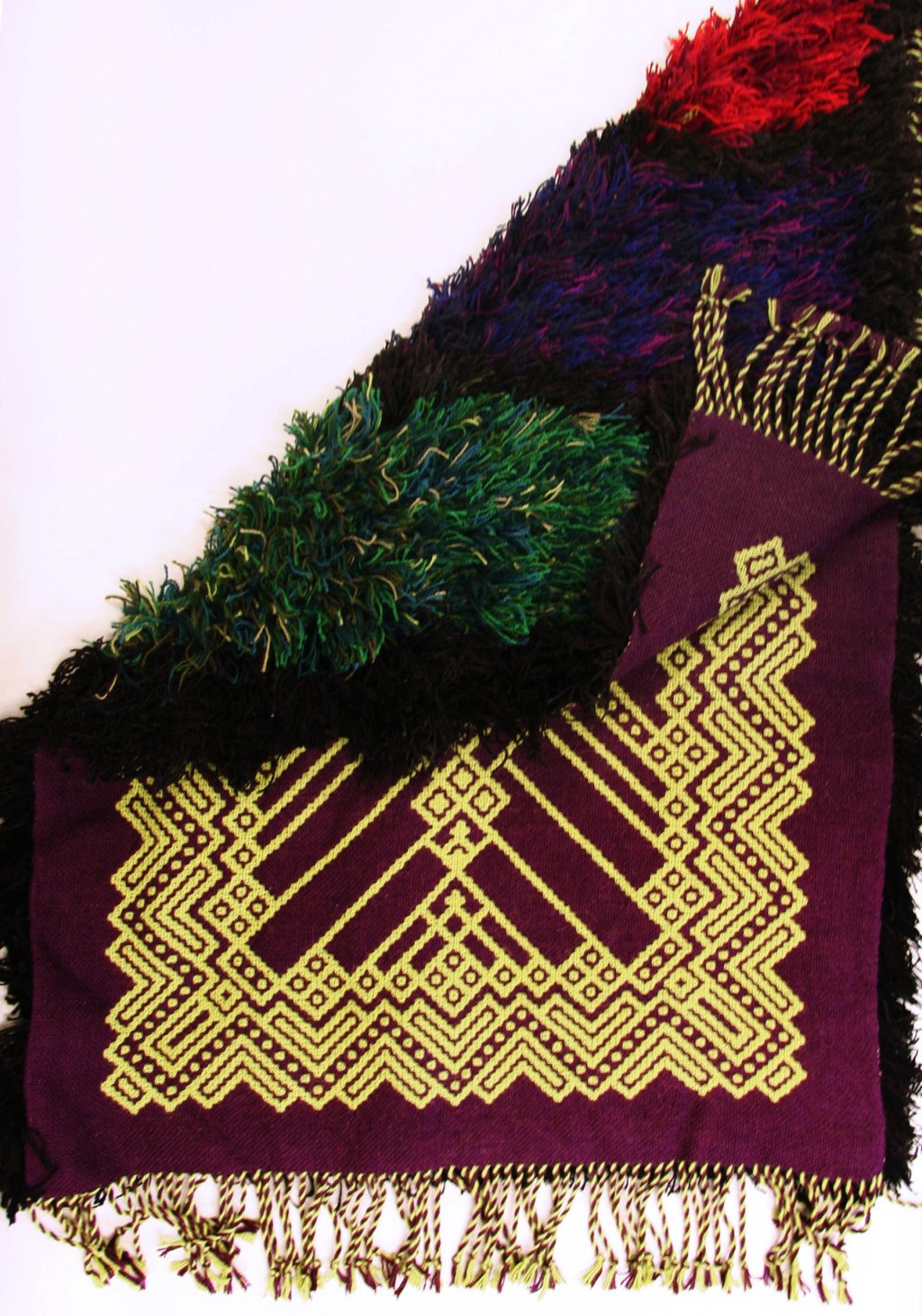On one side of the hanging, Laura wove an intricate pattern in a complex doubleweave technique. She hid the knots of the rya pile between the two layers of the doubleweave. Because the doubleweave pick-up surface needs to be the upper side during weaving, she tied the knots upside-down on the lower surface. (Rya weavers would understand: this is tricky.)