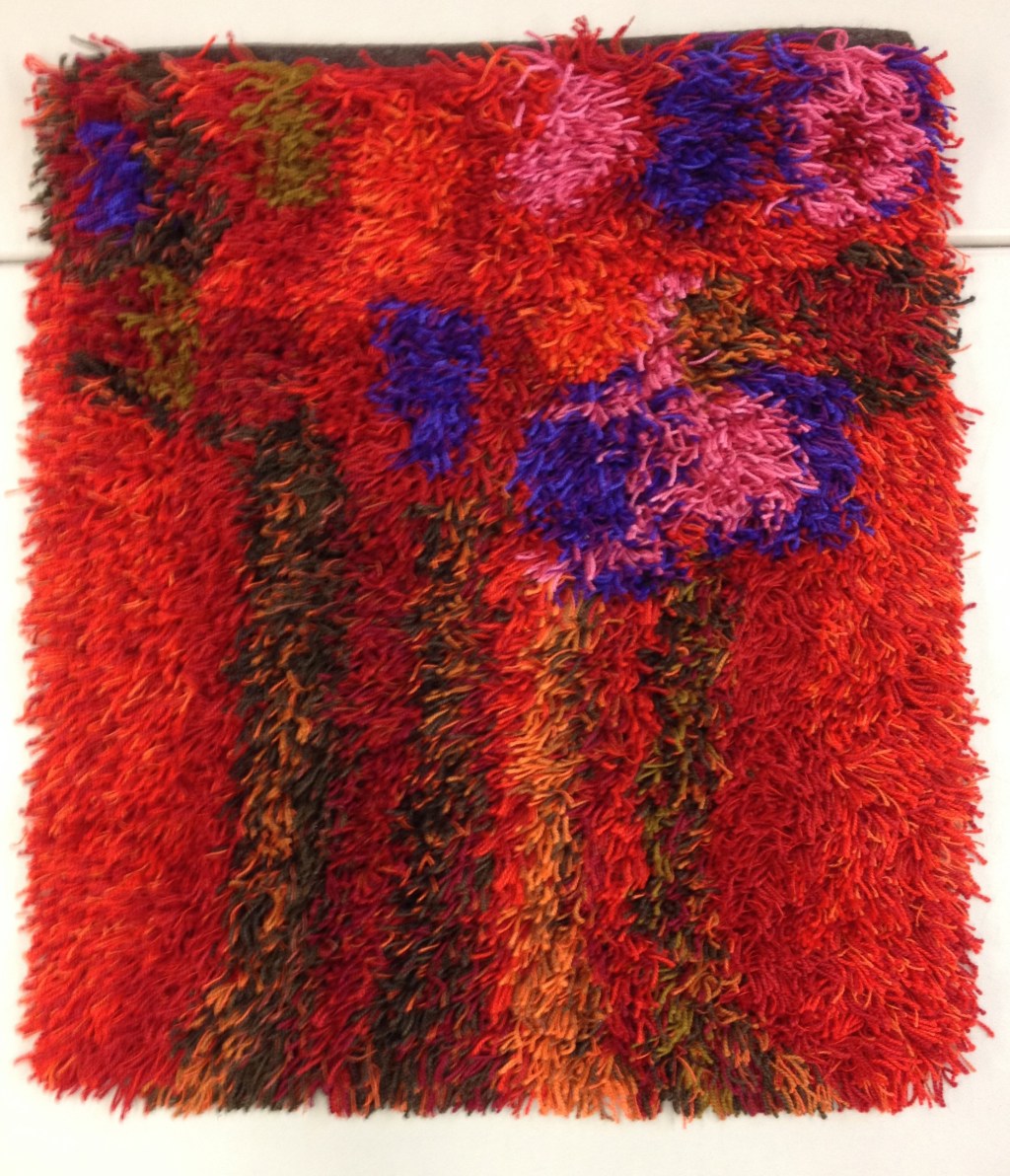 Corwyn Knutson, from St. Paul, wove “Hardanger Cherry Blossoms,” inspired by flowers he saw on a memorable driving trip through Norway. The trees with red, pink, and purple form a beautiful abstract image. It is so deftly balanced, in fact, that it was once hung in an exhibit upside-down and it was just as beautiful! Corwyn’s rya was a double winner at the Minnesota State Fair; it received a blue ribbon and the Doris Tufte award for Creative Loom Weaving in Scandinavian Tradition.
