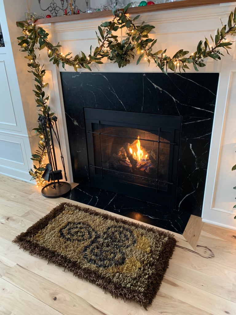 Our group enjoyed a holiday party at the home of Brenda Gavin-Chadwick. Her home is open and light-filled, with clean Scandinavian lines. Only one person brought a show-and-tell item, but somehow Marilyn Moore must have sensed that Brenda’s hearth would be the perfect spot for staging her rya. The three-spiral design echos the three stages in the life of a woman–maiden, mother, and crone.