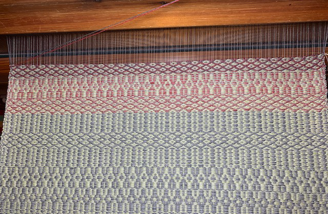 Right before everything shut down, Nancy had just started on a three-shaft rosepath hanging on a loom at the Minnetonka Center for the Arts, based on one she saw in Sweden last year.
