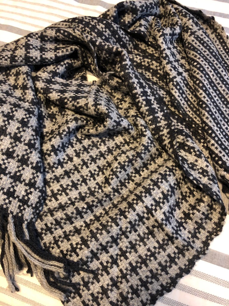 Connie LaTendresse wove samples for an upcoming rigid heddle class, including a houndstooth scarf and a v-necked shawl (pictured below).