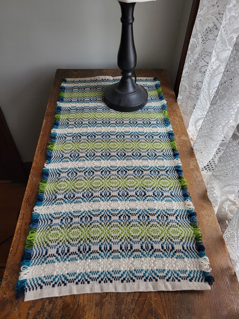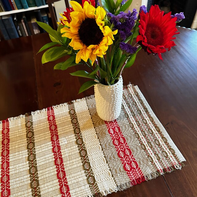 The Scandinavian Weavers’ latest group project was weaving in Telemarksteppe, organized by Lisa Torvik. Lisa was inspired by Laura Demuth’s table runner in a 2013 issue of Handwoven magazine. Laura wrote: