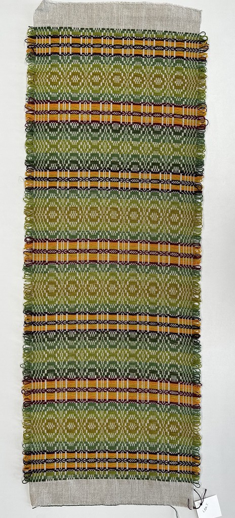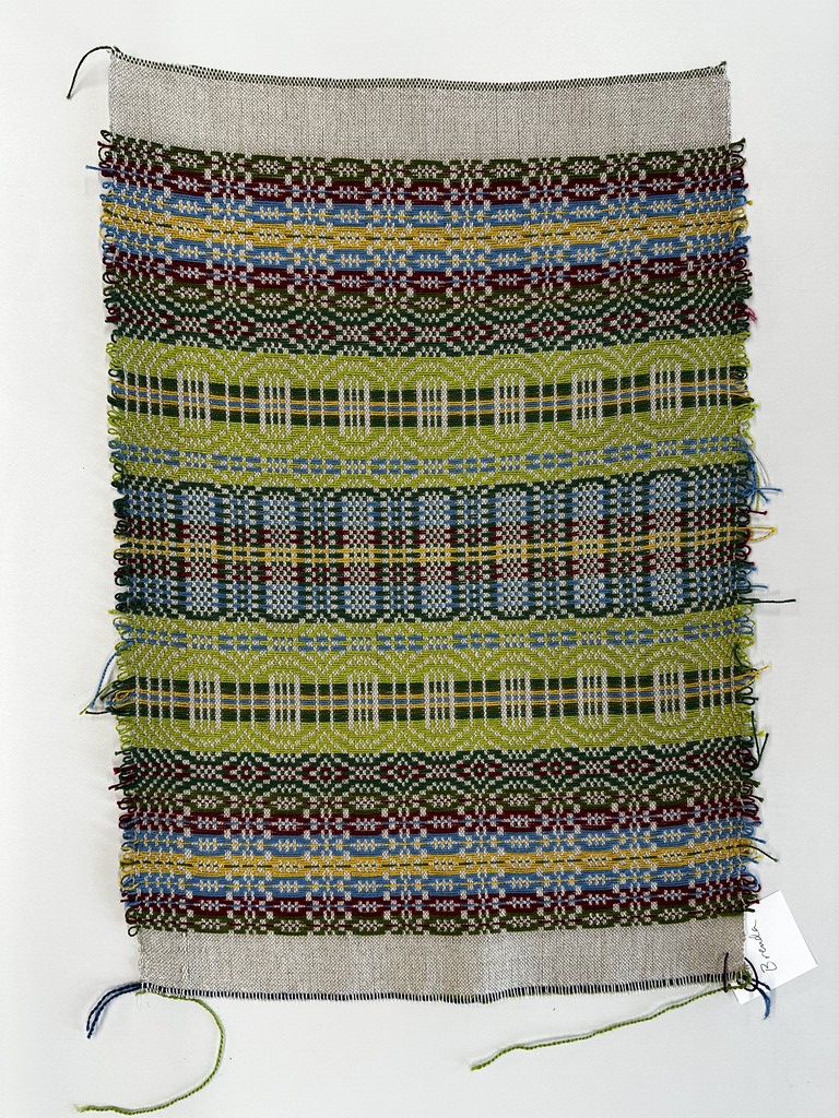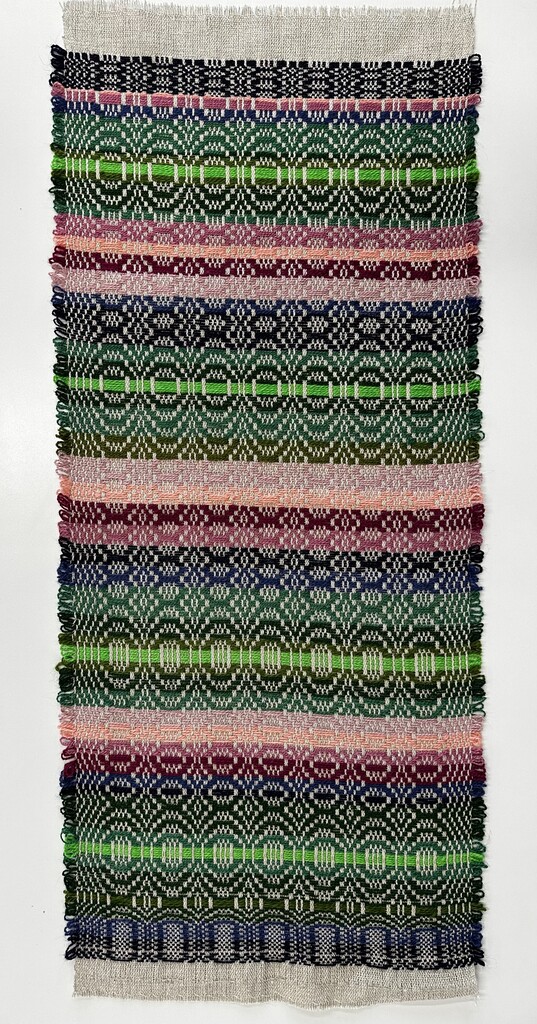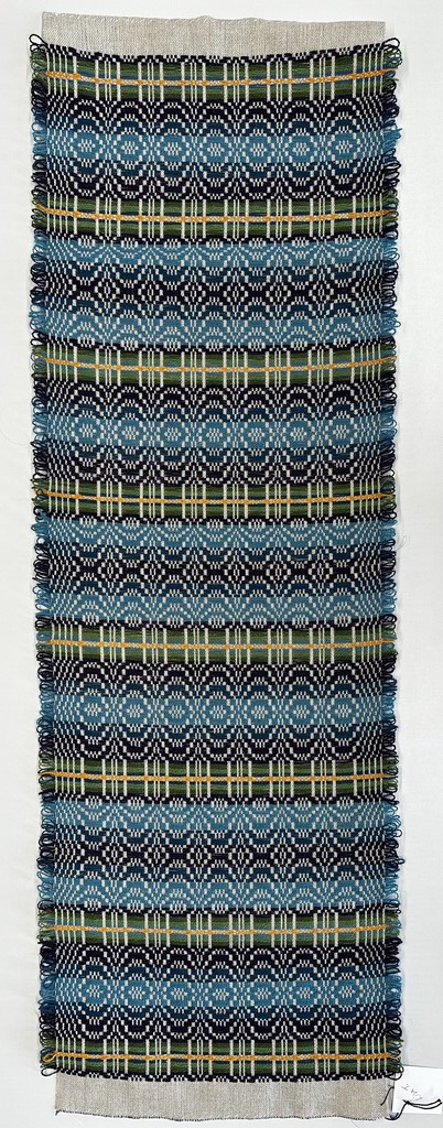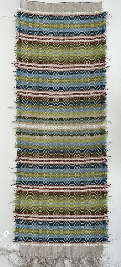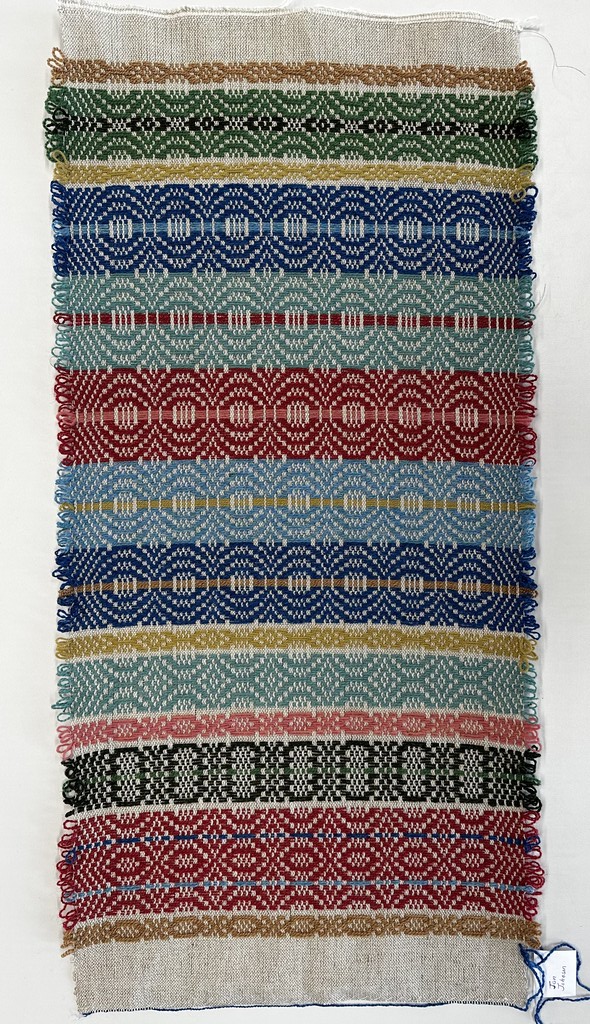“Telemarksteppe is a technique that originates from Telemark, a county located along the southeastern coast of Norway. Using six shafts and five treadles, Telemarksteppe is a three-block weave woven on a tabby ground. This three-block structure allows for more design elements than the two blocks found in monk’s belt. Another aspect of Telemarksteppe that I find especially charming is the inclusion of weft loops along the selvedges. The loops also make frequent pattern-weft color changes easy. A color that is not used for several picks does not have to be cut because its end may be woven into the selvedge and reintroduced by making a loop at the selvedge that blends in with the other weft loops.”