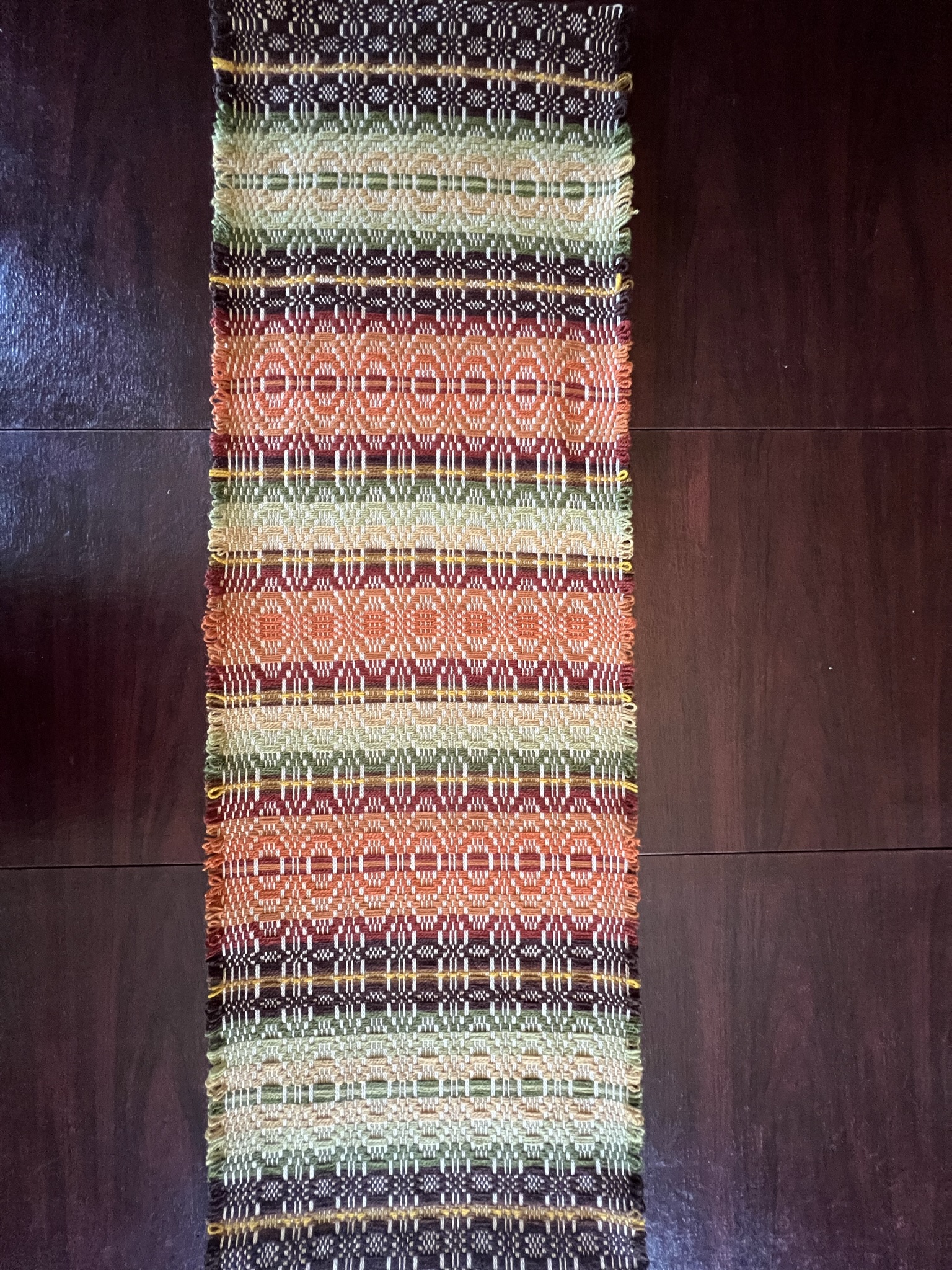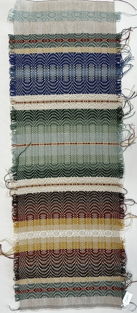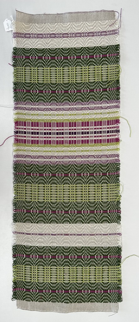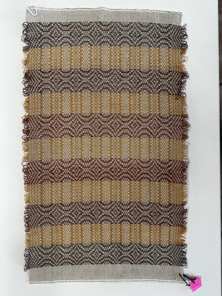 “Telemarksteppe is a technique that originates from Telemark, a county located along the southeastern coast of Norway. Using six shafts and five treadles, Telemarksteppe is a three-block weave woven on a tabby ground. This three-block structure allows for more design elements than the two blocks found in monk’s belt. Another aspect of Telemarksteppe that I find especially charming is the inclusion of weft loops along the selvedges. The loops also make frequent pattern-weft color changes easy. A color that is not used for several picks does not have to be cut because its end may be woven into the selvedge and reintroduced by making a loop at the selvedge that blends in with the other weft loops.”