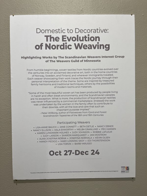 The Scandinavian Weavers’ new exhibit “Domestic to Decorative: The Evolution of Nordic Weaving” is now open at Red Wing Arts in Red Wing, Minnesota. The exhibit is free and open to the public during regular hours at Red Wing Arts. (Thursday through Monday 12:00 to 5:00 PM / Saturday 9:00 AM to 5:00 PM/ Tuesday and Wednesday by appointment)