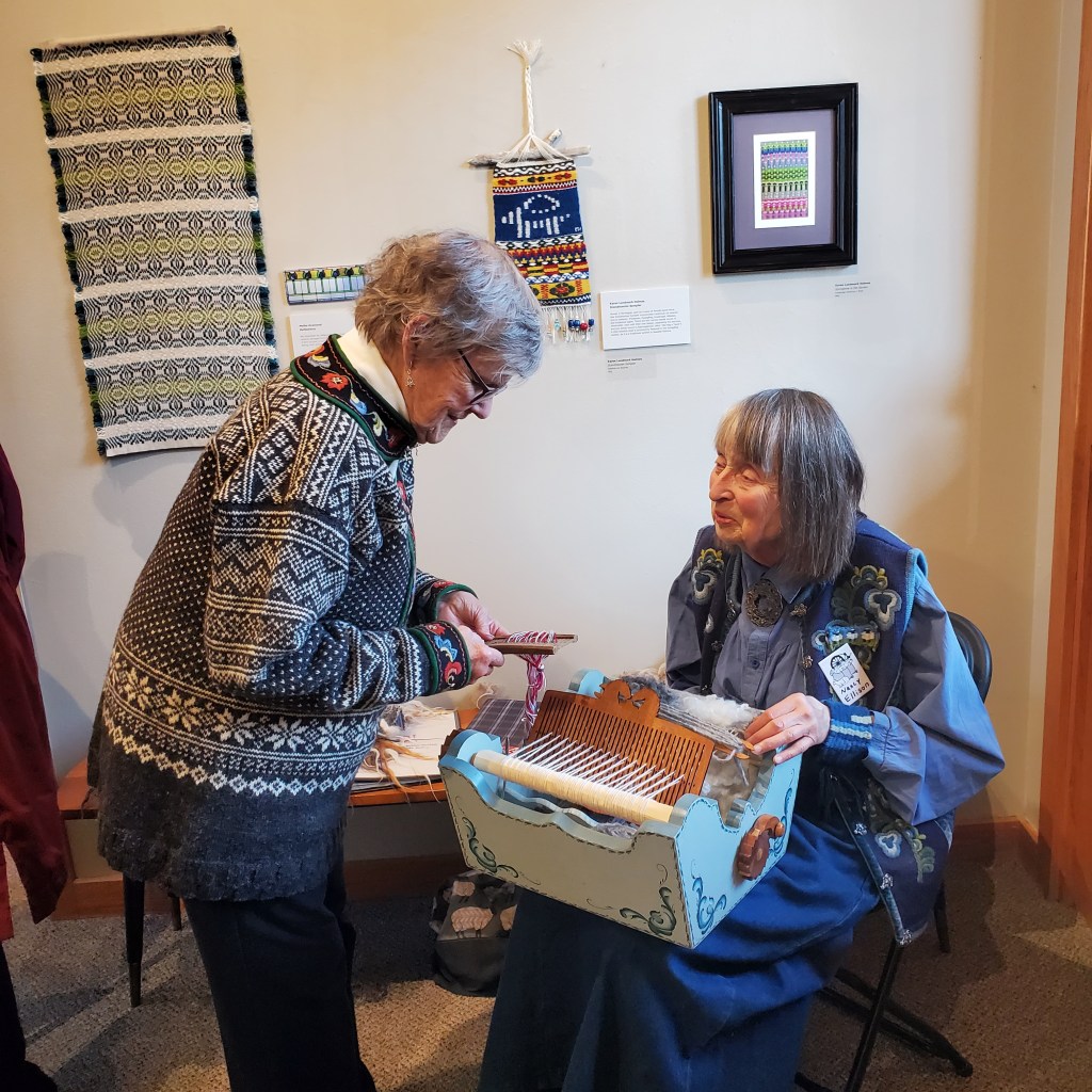 Edi and Nancy compare weaving techniques. Edi wove a band using a hand-carved heddle, while Nancy wove rya on a Norwegian cradle loom.