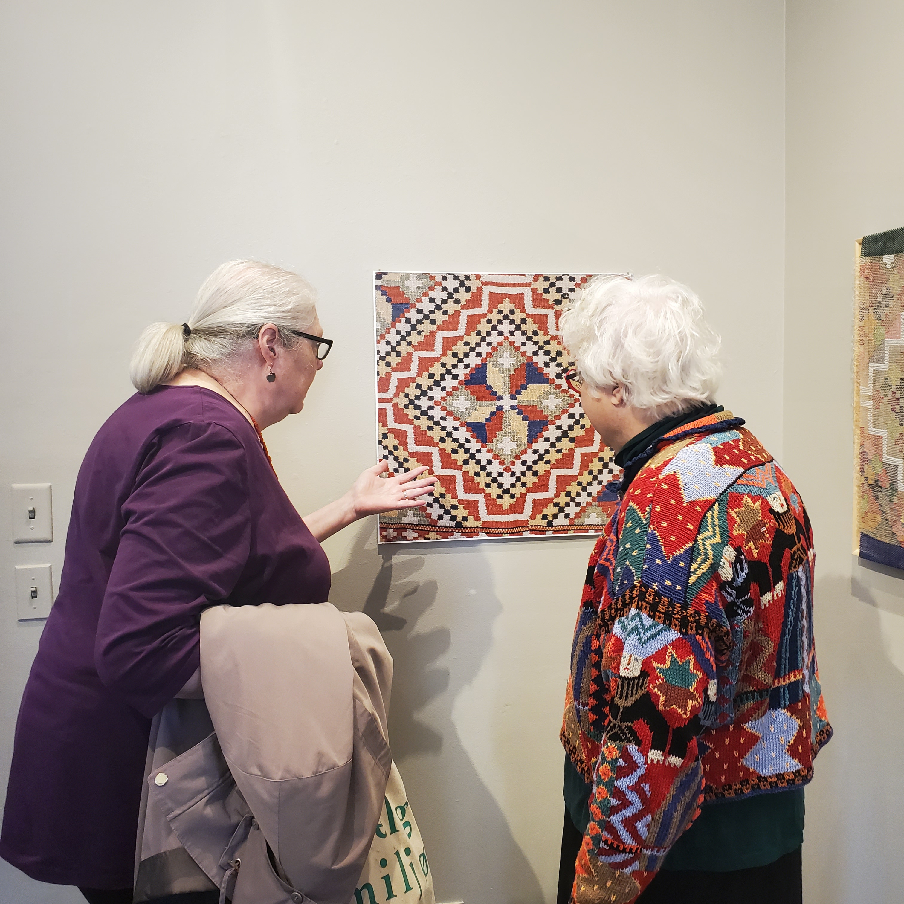 Lisa Torvik shows Mary Skoy the antique coverlet from the Sogn region that inspired her transparencies.