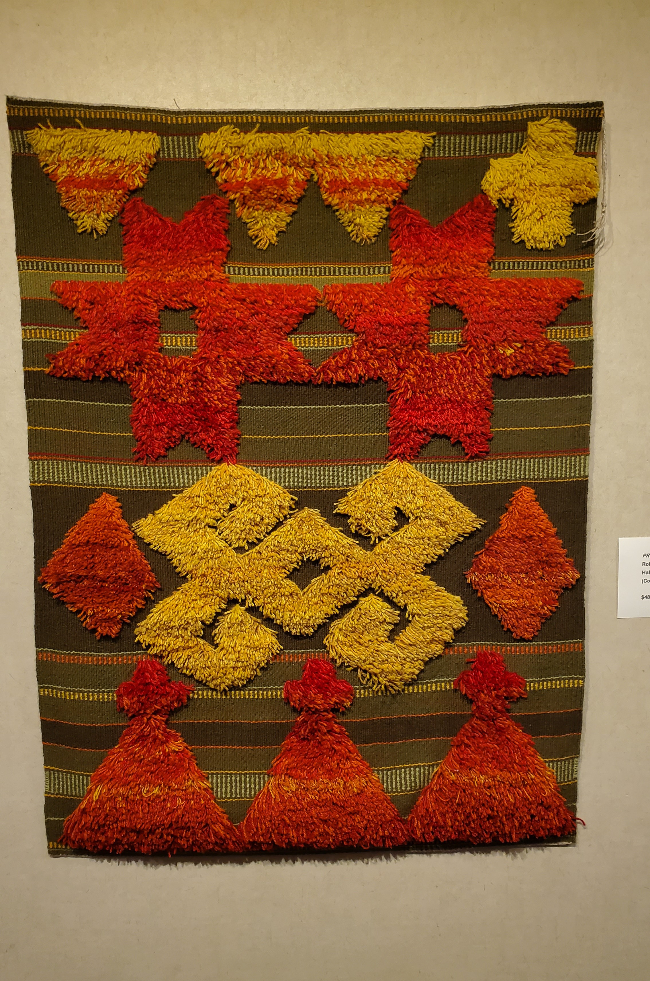 Robbie LaFleur wove this colorful half-flossa wall hanging, called “Protection,” for the Scandinavian Weavers previous exhibit “Myths, Symbols, and Fairy Tales.” Half-flossa technique includes alternating sections of plain weave and short pile.