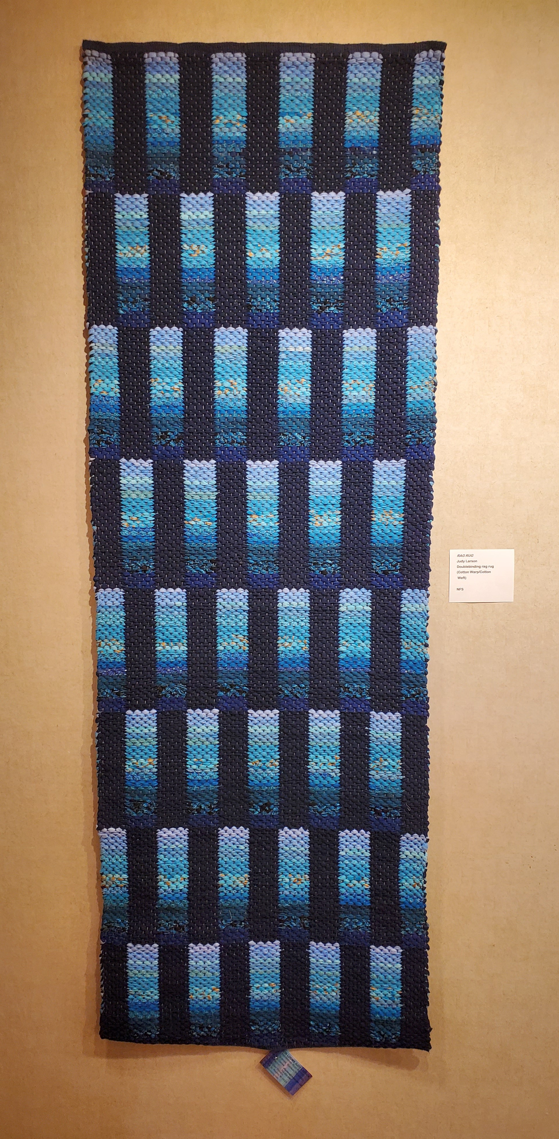 Judy Larson wove this stunning rag rug called “Rippling Water.” The rug is a double binding rug in which smaller strips of multiple blue fabrics were sewn together to contrast with the navy solids. “Rippling Water” was a labor of love. “Even with all the fabric prepped and already on the shuttles,” Judy explains, “this rug took 8 hours to weave at the loom!”