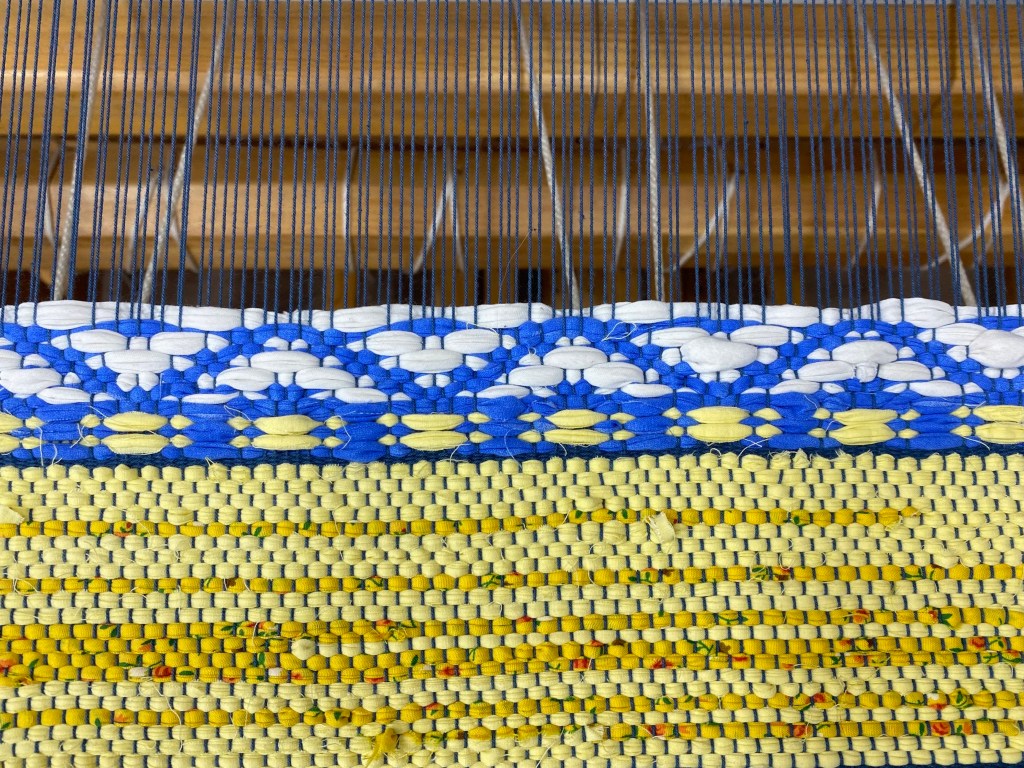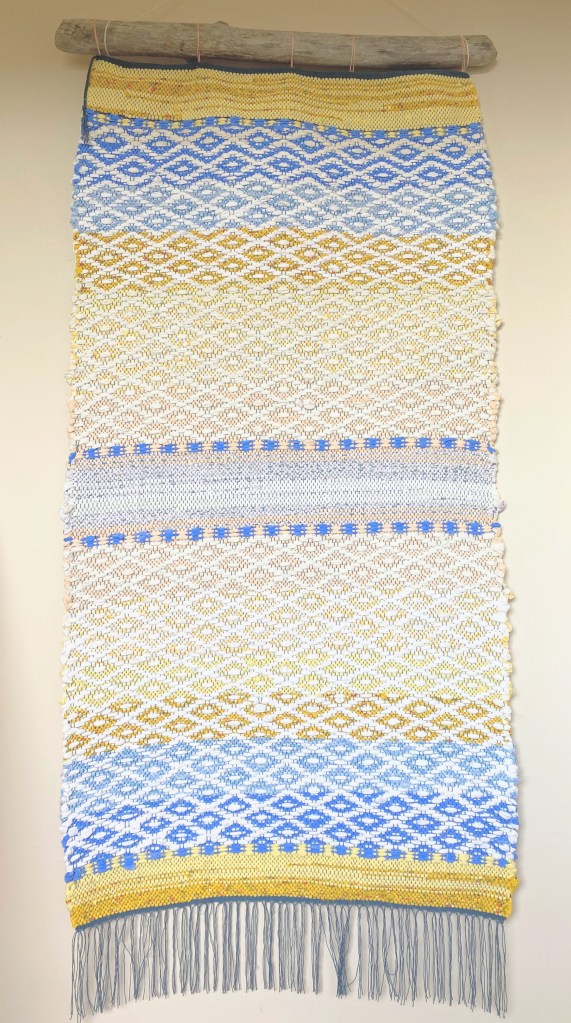 Description: My first rag rug. It was woven in conjunction with the Karin Larsson “Let the Hand Be Seen” exhibit at the American Swedish Institute in 2024. The color scheme is comprised of cloth my mother had leftover from when I was a little girl: the curtains from my bedroom, a blanket from my sister’s bed, extra fabric from a doll pillow. I supplemented the color scheme with some purchased cloth and some kindly shared with me. The rosepath pattern in white I feel creates somewhat of a gate that you can look through to the gradient from peach to periwinkle, much like the Belt of Venus that is so visible at sunrise and sunset. The organic striations at the center are very much to me a lake that reflects a gradient sky onto the water. This year I have done a lot of visiting the North Shore, where I am from, and have been totally captured by the Belt of Venus over Lake Superior. Serene, restful, cheerful.