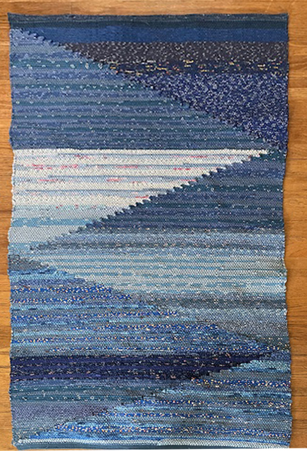 Bio: Judy Larson began weaving when her mother got her great-grandmother’s loom out of the grainery 22 years ago. She was given a used loom, and began her learning journey, always ready to take on a challenge. Primarily a rug weaver, she enjoys using fabrics in creative ways and exploring Scandinavian weaving traditions. Retired from teaching elementary school, she now teaches weaving and enjoys sharing her passion with weavers of all ages. Judy Larson now has a weaving studio at Color Crossing in Roberts, Wisconsin where she weaves on an 8-foot Cranbrook loom and a 10-foot Glimakra loom. She incorporates several different techniques such as shaft switching, taquete, and rosepath into her weavings. She is the leader of the Rag Rug group at the Weavers Guild of Minnesota, and is active in the Scanweavers and New and Occasional Weavers study groups. Weaving encourages her to play with color, texture, design, pattern, and materials. There is enough challenge and new learning to keep her busy for years, creating pieces that are uniquely hers, while still being functional. Combining design, color, and durability always leads to wonderful surprises, even when carefully planned out, which keeps weaving both amazing and satisfying.