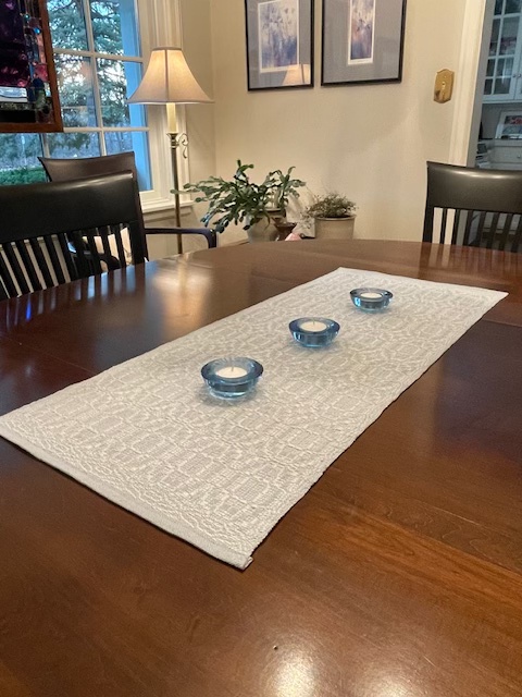 Description:I discovered the pattern for this table runner in a Handwoven magazine from 1997, which was in a stash of old magazines I bought at the Weaver’s Guild. This pattern caught my attention, as the author of the article mentioned she needed to weave a gift for three weddings that year. I was planning to weave something special for two upcoming weddings, a year apart. This pattern is called a “Name Draft” – thus the title “Happy Wedding Day.” In a name draft, each letter of the alphabet is assigned to one of the four shafts on the loom. This can be done either systematically or randomly. This seemed rather magical and I was intrigued how this could work to create something so lovely. I was also thrilled that someone else had worked it out for me. It seemed serendipitous to find this pattern named “Happy Wedding Day” with two upcoming weddings in the family! I have now completed three of these table runners in various lengths, all in neutral colors, like stone and silver grey with white. This one I might keep for myself, but if there is another wedding soon, I am ready!
