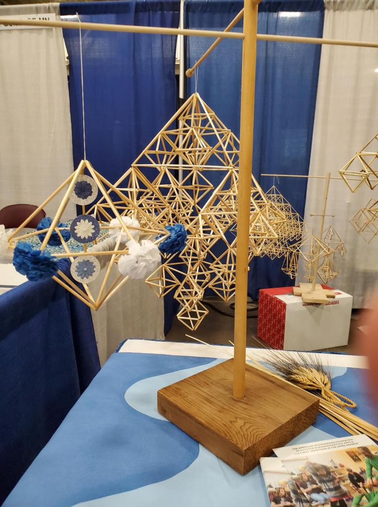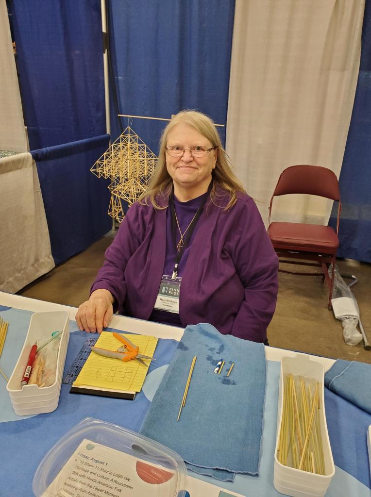Mary Erickson demonstrated the art of himmeli and also participated in a panel discussion with fellow Nordic American folk craft artists. Himmeli, geometric figures made from straw, were originally created in Finland, Norway, Sweden, and Estonia, and functioned as good luck charms that were hung from the ceiling in homes to ensure good crops and the fertility of fields.
