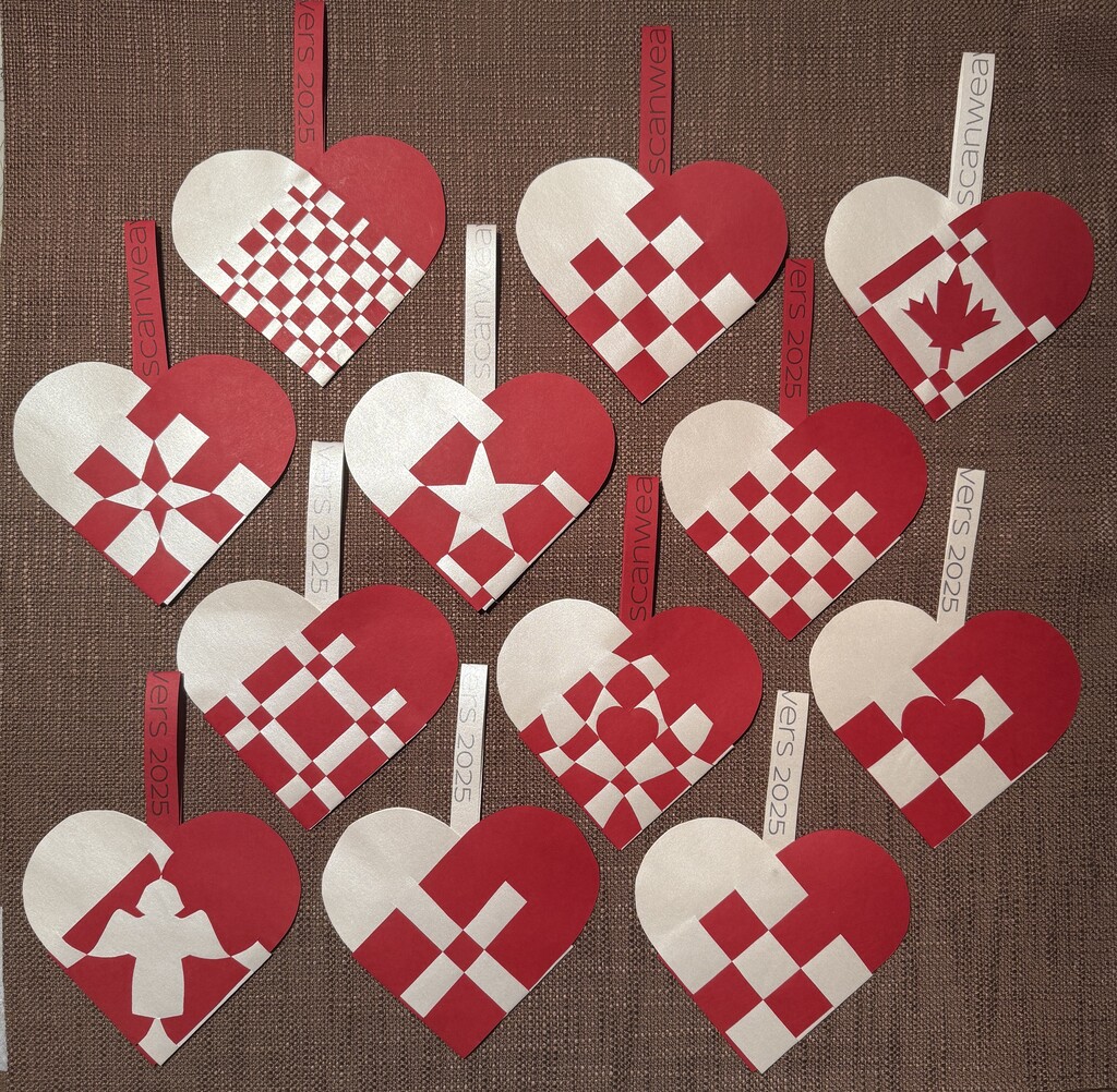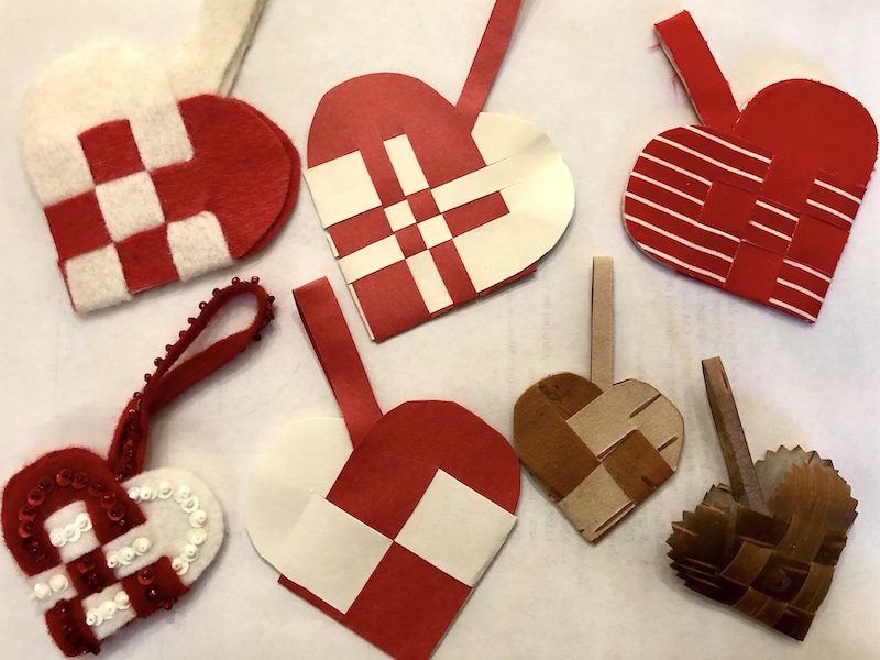 Mary Erickson wove a variety of hearts using paper, felt, and even birch bark.
