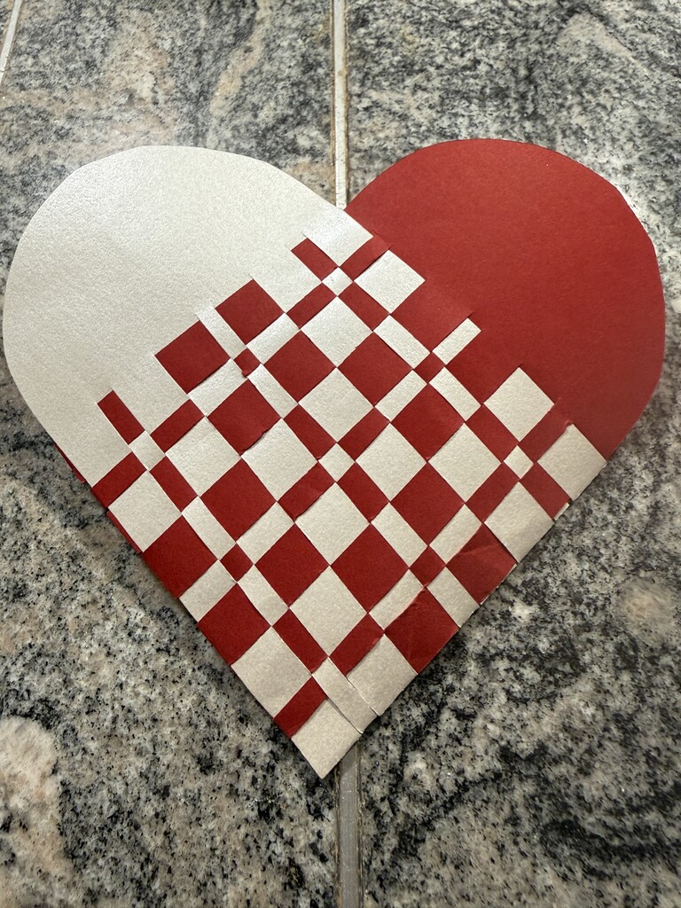 Peg recommends a high-quality paper that won’t tear during the weaving process. Bone folders come in handy to make clean folds, and a good sharp pair of scissors are a must! Peg wove the lovely and meticulous heart below.