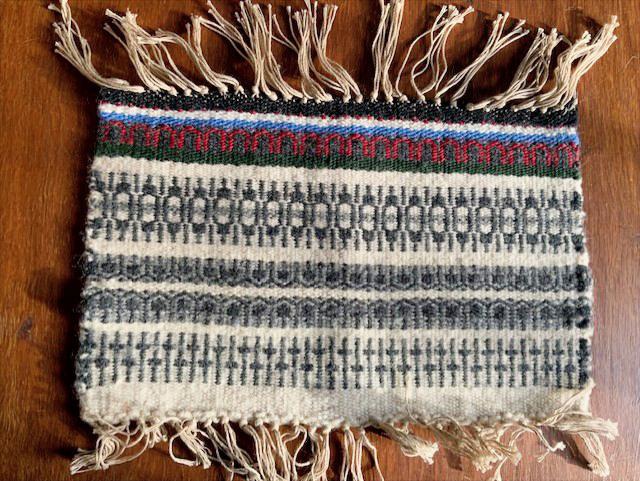 Nancy also wove the above sampler in a class she took from Katharine Dickerson at Vesterheim Norwegian-American Museum. “After weaving with the black, gray, and white yarn and drafts supplied in the class we were encouraged to try something on our own, so I wove a row of red covered bridges with blue sky and green grass as the covered bridge at Zumbrota, Minnesota is a local tourist attraction here.”