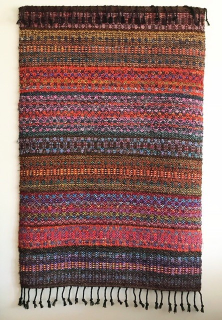 Robbie has also woven Flesberg using strips of fabric as weft, as in the wall hanging below. It is her favorite piece in the technique.