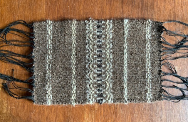 “This was my weaving that I did for the Exhibit of the Flesberg Study Group in Decorah in October 2005,” she writes. “It was in natural colors of brown, gray, and black yarn from Shetland and Icelandic sheep in my flock a the time.” Nancy spun the white yarn from wool she purchased during a textile tour of Norway.