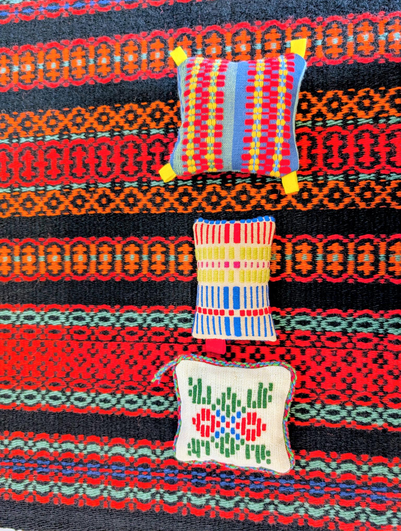 Nancy Ebner wove the Flesberg wall hanging below, using instructions from the Norwegian Textile Letter, which devoted an issue to the technique in November, 2020. Nancy’s weaving is shown with her samplers of Swedish art weaves, which she cleverly made into pin cushions.