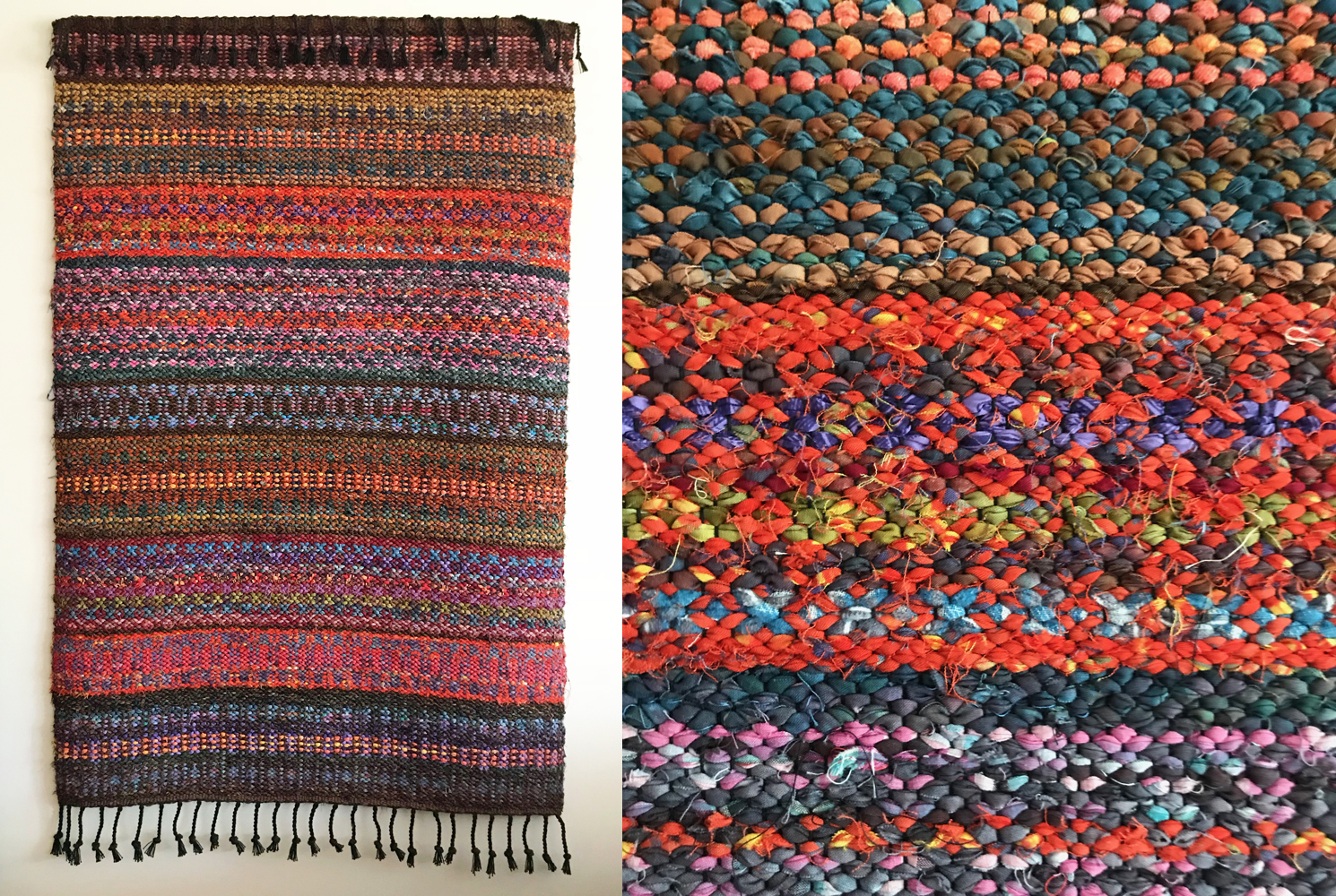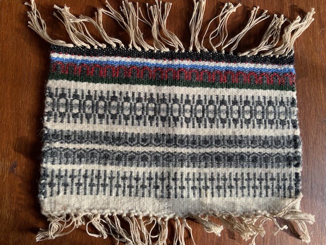 Nancy wove the above sampler in a class she took from Katharine Dickerson at Vesterheim Norwegian-American Museum. “After weaving with the black, gray, and white yarn and drafts supplied in the class we were encouraged to try something on our own, so I wove a row of red covered bridges with blue sky and green grass as the covered bridge at Zumbrota, Minnesota is a local tourist attraction here.”