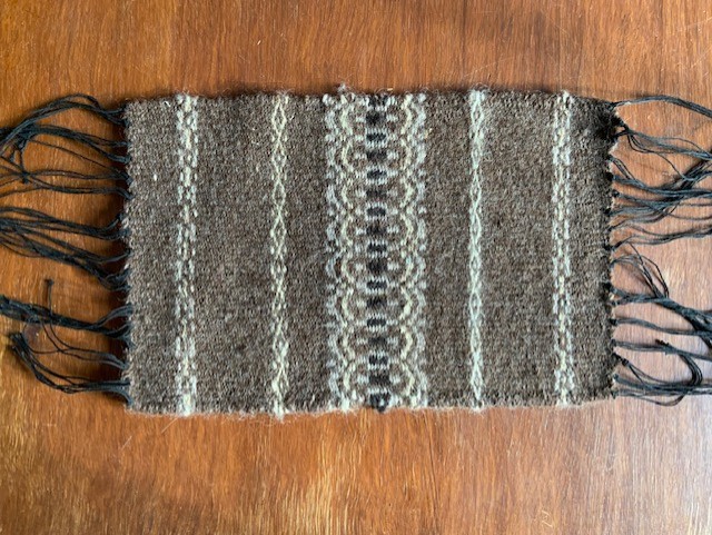 Nancy Ellison created the weaving above for an exhibit of the Flesberg Study Group in Decorah in October 2005. Nancy writes, “[This weaving] was in natural colors of brown, gray, and black yarn from Shetland and Icelandic sheep in my flock at the time.” She spun the white yarn from wool she purchased during a textile tour of Norway.