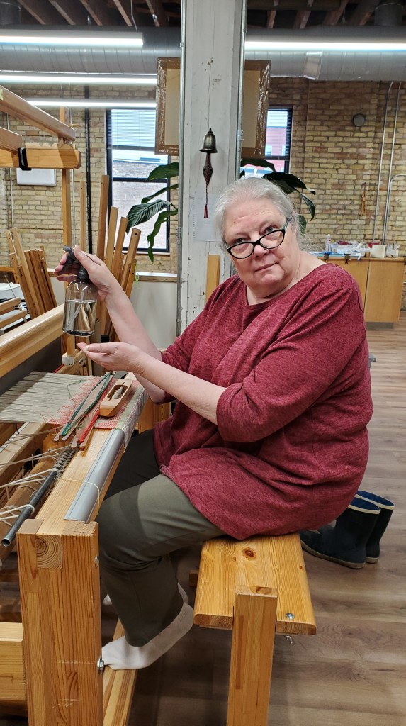 Lisa reminds everyone to spritz the linen warp with water to prevent breakage. (Lisa does this every time she advances the warp, which she does every three to four inches.)