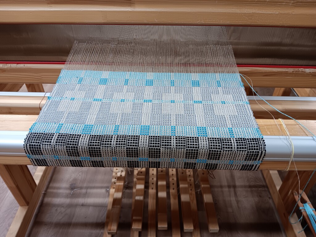 We first saw the Dukagång and Blådrättar. Blådrättar means “blue dish” in Swedish and refers to the fact that this type of Dukagång was traditionally done in blue and white/cream, similar to the colors on porcelain dishes. In Dukagång, the wool pattern weft is laid in fine rows separated by thin lines of tabby wefts.