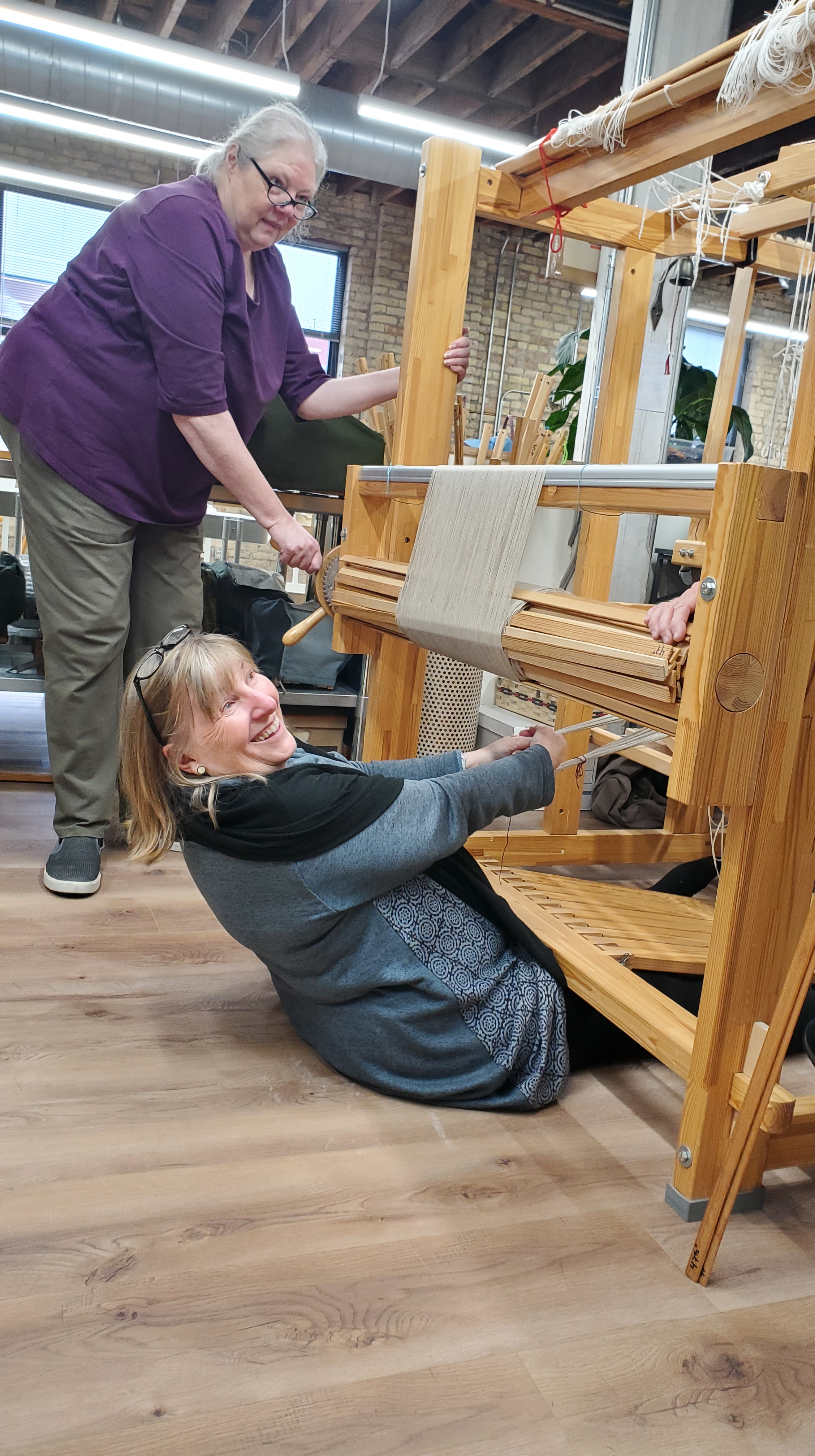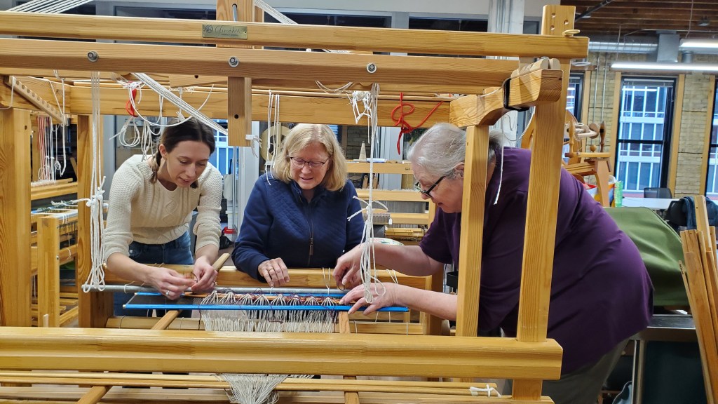 This was our first group project in the new home of the Weavers Guild of Minnesota, the Open Book building in Minneapolis. It was a joy to work in this bright space and also have the opportunity to demonstrate weaving Telemarksteppe to visiting students, guests, and Guild members.