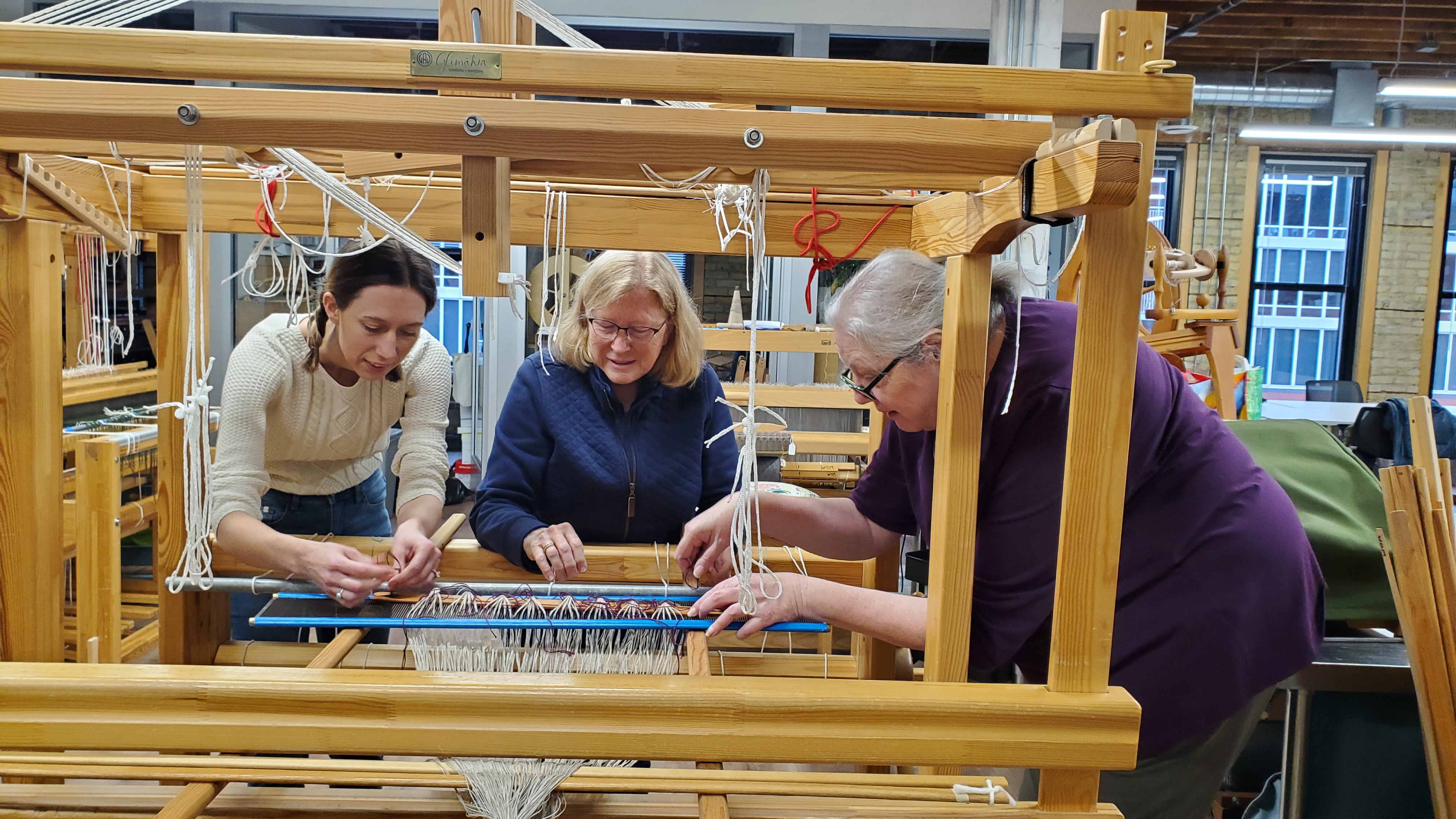 Warping is always more fun with a group! (Especially with coffee breaks.) Below, Lisa Torvik explains the benefits of pre-sleying the reed to newer weavers Holly and Beth.