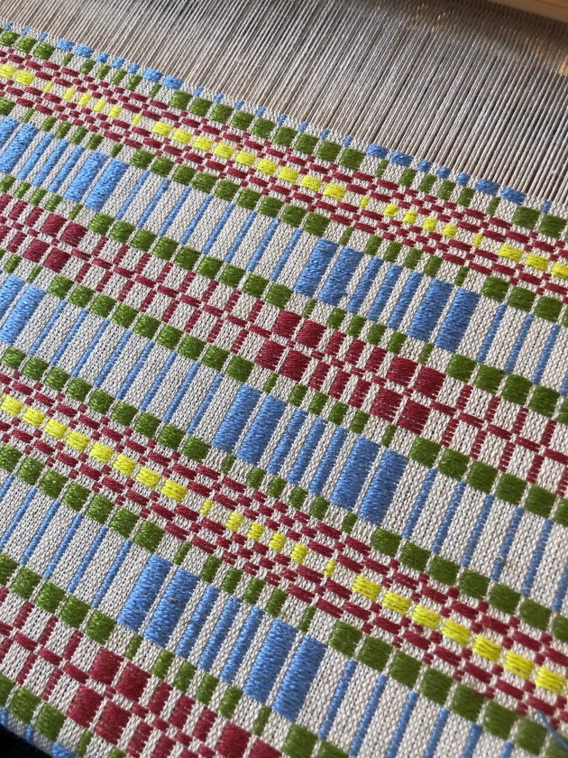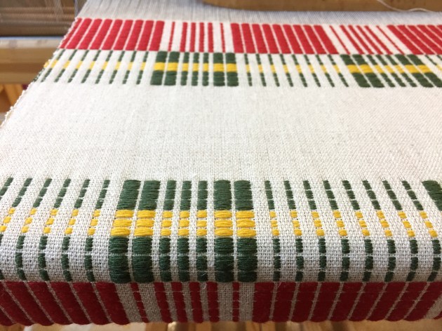 Beth wove a classic three-shed krokbragd technique using a rigid heddle loom.