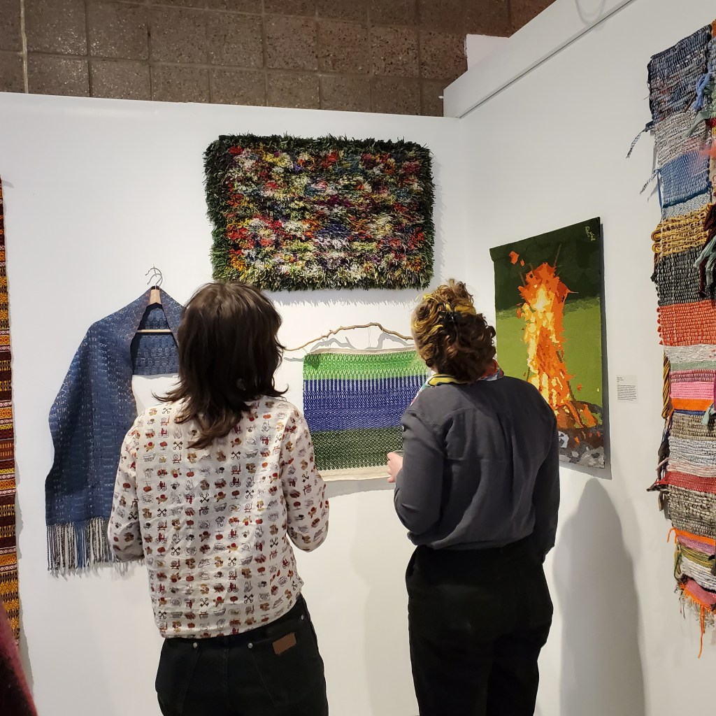 Kala Exworthy wove the colorful cape in a point twill in diamonds. The warp is Zephyr, spaced to show off the weft, which is a soft knitting yarn. “I wove it as fabric not knowing what it would be,” Kala writes. “Then it became a nice, warm dress up cape. Perfect for the cooler evenings of a lovely spring or fall day in our northern clime.” Northern Cape was the subject of a lively bidding war during the opening night reception for “Weaving the North.” The lucky winner got to wear the cape home at the end of the exhibit! (Riley’ Kleve’s Community Cloth is in the background.)