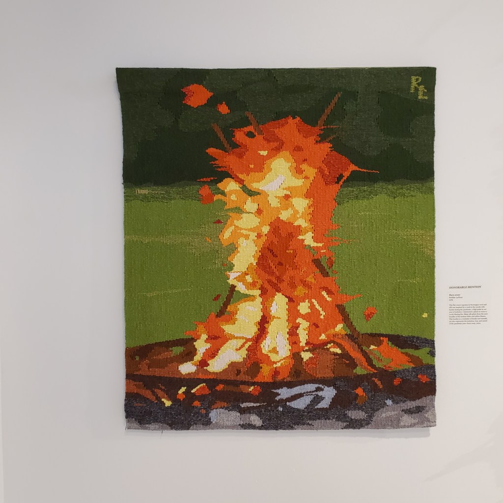 Robbie LaFleur is an expert in billedvev, traditional Norwegian tapestry weaving. The tapestry was woven in wool, with silk thread added to lend luster to the areas of the hottest white and yellow flames. Robbie designed the tapestry after a photo of a bonfire at a family gathering. She writes, “The bonfire is a reminder of family and warmth, yet also represents the isolation, loss, and unrest of the pandemic year—burn away, 2020.” Robbie won Honorable Mention in “Weaving the North” for her piece. For more on this tapestry, visit Robbie’s blog at the link below: