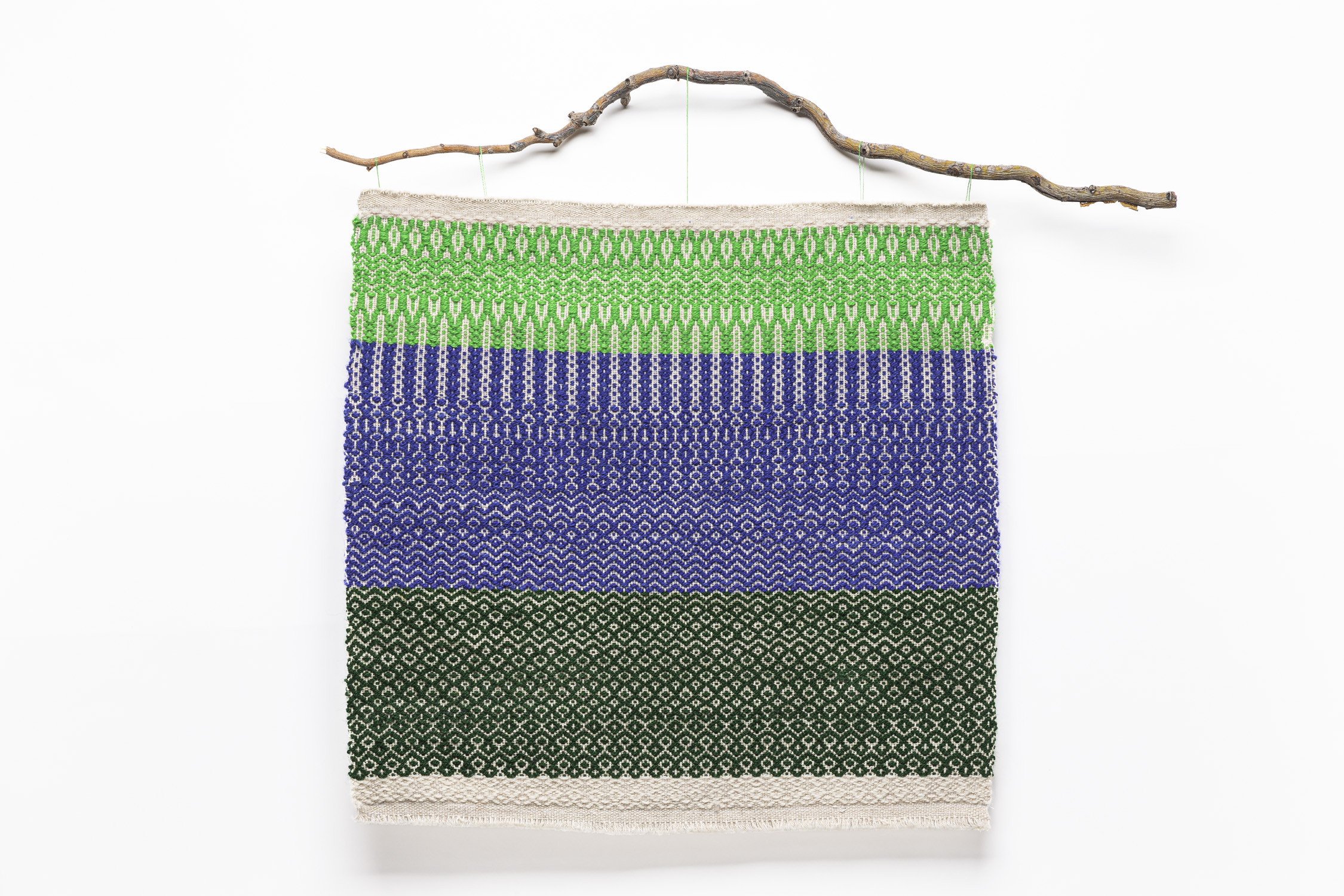 This charming tapestry was woven on a simple frame loom. Karen Holmes chose seine twine for warp, wool for weft, and used the leftover warp to make the decorative top-knot and beaded fringe. The piece is woven in traditional Scandinavian colors to celebrate her Swedish and Finnish heritage.