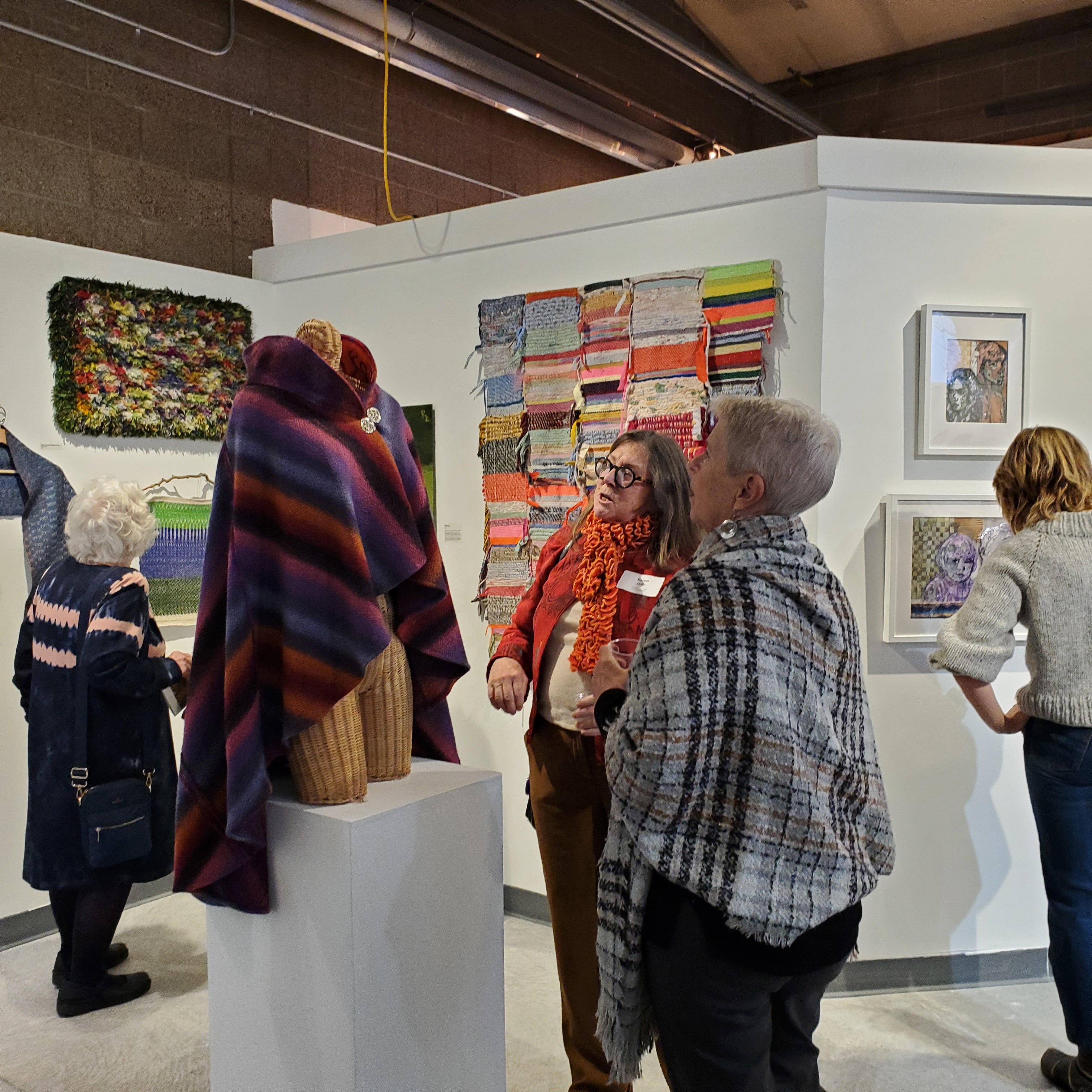 Kala Exworthy wove the colorful cape in a point twill in diamonds. The warp is Zephyr, spaced to show off the weft, which is a soft knitting yarn. “I wove it as fabric not knowing what it would be,” Kala writes. “Then it became a nice, warm dress up cape. Perfect for the cooler evenings of a lovely spring or fall day in our northern clime.” Northern Cape was the subject of a lively bidding war during the opening night reception for “Weaving the North.” The lucky winner got to wear the cape home at the end of the exhibit! (Riley’ Kleve’s Community Cloth is in the background.)
