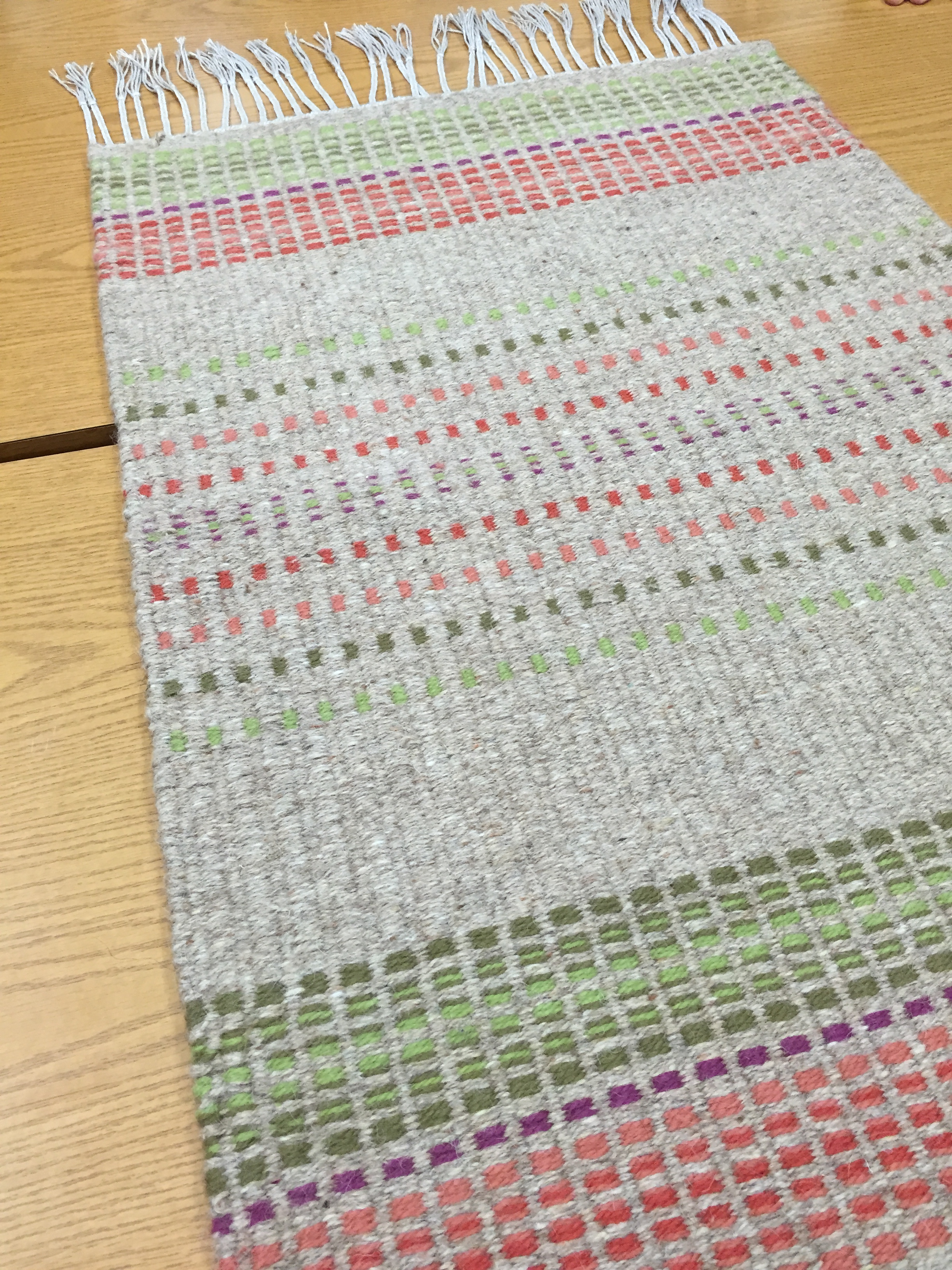 Rya on Pick and Pick Backing. 14″ x16” Cotton warp, wool weft, wool and linen pile