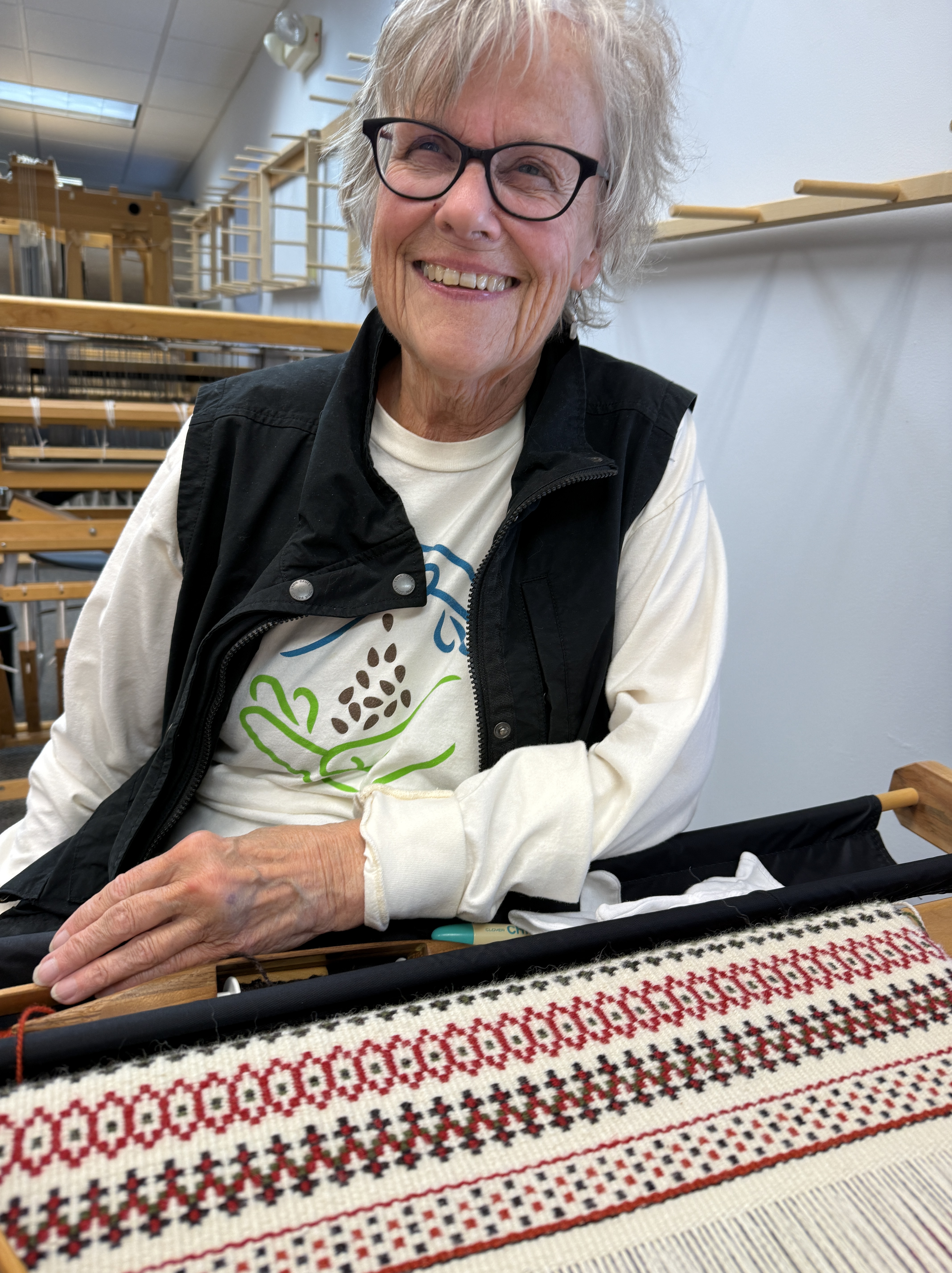 Bio: Edi Thorstensson has been weaving since 1963, when she enrolled in a summer class in beginning weaving at the Chicago Art Institute. The class was taught by Lurene Stone and occasionally visited by Elsa Regensteiner, who was head of the Weaving Department at the Art Institute and a noted author and textile designer. Being a student in the Art Institute School at the time placed Thorstensson in a social context very different from the Chicago suburb, La Grange, in which she had grown up and the college, St.Olaf, where she had just completed her first year. Her classmates were public school art teachers, aspiring textile designers, artist activists, students of all ages, with diverse economic backgrounds, racial identities, and life experiences and goals. The Civil Rights movement was gaining momentum, and it influenced students’ relationships to each other both inside and outside the classroom. For Thorstensson, the summer weeks of 1963 at the Chicago Art Institute, was an introduction to weaving much more than cloth. Thorstensson has continued her textile studies at Mora Folkhögskola and Skånska Hemslöjd in Sweden, in Tromsø and other settings in Norway, and, in the US, Sievers School of Fiber Arts, the Weavers Guild of Minnesota, North House Folk School, and Vesterheim Norwegian American Museum. She has taught weaving classes at Gustavus Adolphus College and the Arts Center of St. Peter. She is a retired librarian and college archivist who lives in St. Peter, Minnesota.